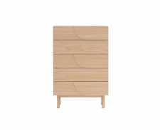 Kommoden kombinerer æstetik og funktionalitet på bedste vis, hvor det naturlige udtryk i MDF med egetræsfiner møder massive træben for øget stabilitet og holdbarhed. De dekorative detaljer i form af sol- og månmotiver på skuffefronterne tilføjer en subtil karakter og giver møblet et personligt præg.