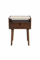 Bordet er fremstillet i træ med en dyb valnødfarve, der harmonerer smukt med den cremefarvede stenplade på toppen. Denne kombination af naturlige materialer giver en sofistikeret kontrast, der straks løfter indretningen. Arda natbord har også et subtilt ribbemønster på træoverfladen, hvilket fremhæver den elegante design. De koniske ben, inspireret af 1950'ernes retrostil, skaber en stilfuld vintagefølelse, perfekt for dig, der ønsker at kombinere retrodesign med nutidens moderne kvalitet.