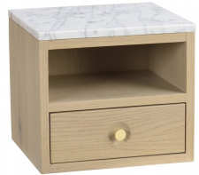 | Materiale: | Fremstillet i egfinér på MDF. Skuffefront i massiv eg , inderskuffe i løvtræ , skuffeskinner i metal og top i hvid marmor. |
