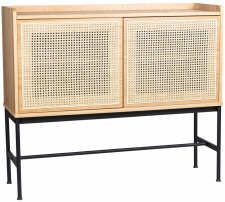 | Materiale: | 18 mm MDF-plade med egetræsfiner , metalben. , rattanvægget dør |
