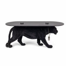 Fra det hollandske mærke Bold Monkey, kendt for sine unikke og iøjnefaldende møbler, er dette sofabord en perfekt blanding af funktion og kunst. Den kraftfulde sorte panter bærer den mørke, røgfarvede glasskive med selvsikker stil, hvilket gør bordet til et øjeblikkeligt midtpunkt i ethvert rum – både praktisk og visuelt spektakulært.