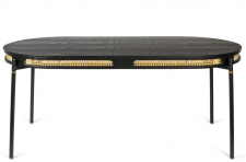 | Materiale: | 20 mm bordplade. Finéret krydsfineramme. Rattan detalje kant. Pulverlakerede jernben med guldplade. |