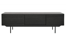 | Materiale: | der lukker to rum med hver flytbare hylder. , TV-bænk i sort egfinér MDF. Mattsorte pulverlakerede metalben. 1 skuffe og 2 skydedøre |